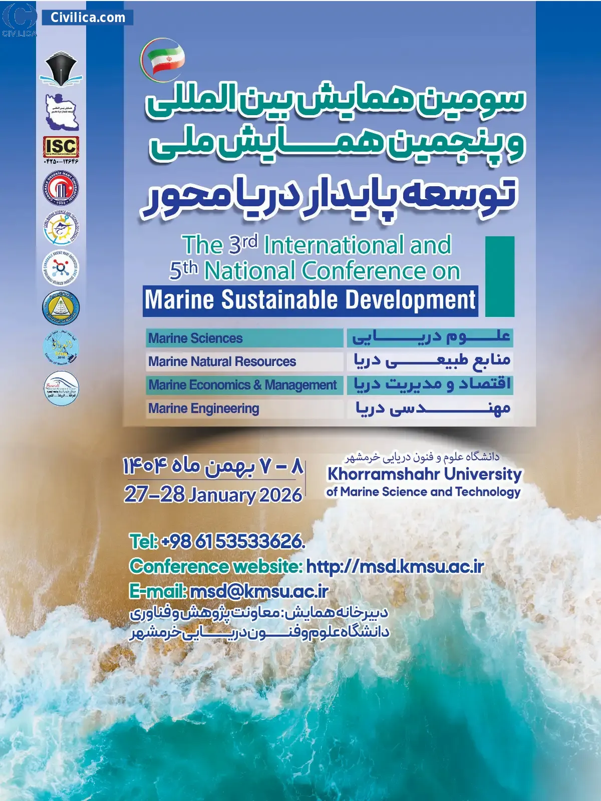سومین همایش بین المللی و پنجمین همایش ملی توسعه پایدار دریا محور در تاریخ ۵ بهمن ۱۴۰۴ توسط دانشگاه علوم و فنون دریایی خرمشهر، در شهر خرمشهر برگزار خواهد شد.با توجه به اینکه این همایش به صورت رسمی برگزار می گردد، کلیه مقالات این کنفرانس در پایگاه سیویلیکا و نیز کنسرسیوم محتوای ملی نمایه خواهد شد و شما می توانید با اطمینان کامل، مقالات خود را در این همایش ارائه نموده و از امتیازات علمی ارائه مقاله کنفرانس با دریافت گواهی کنفرانس استفاده نمایید.
