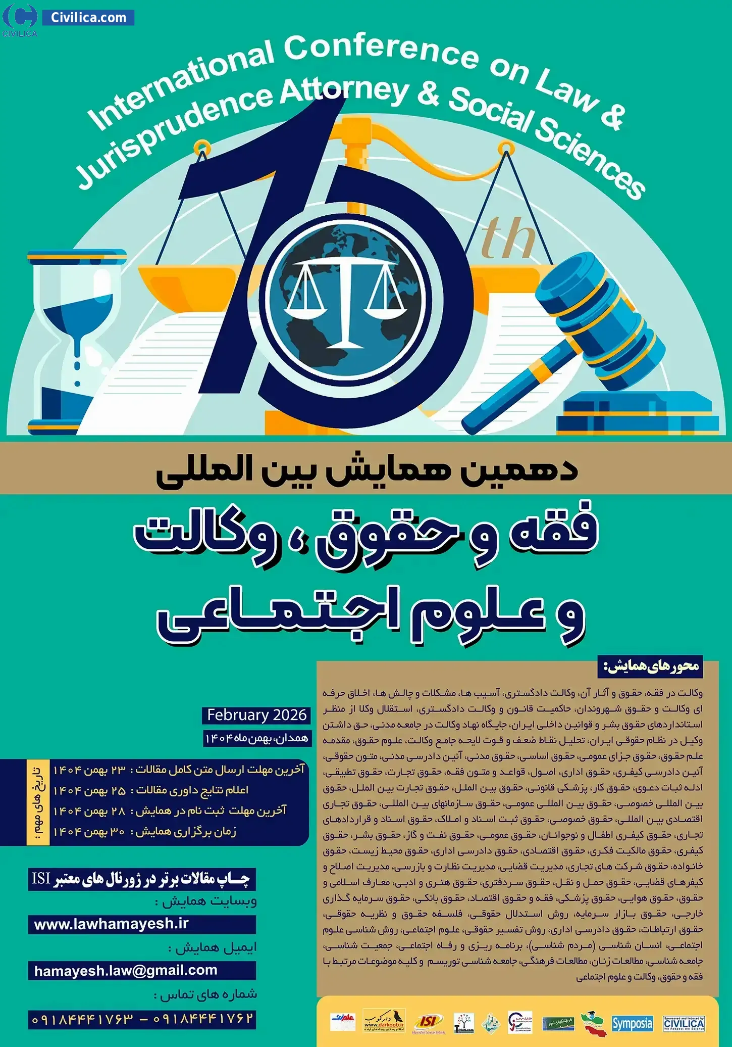 دهمین همایش بین المللی فقه و حقوق، وکالت و علوم اجتماعی در تاریخ ۳۰ بهمن ۱۴۰۴ توسط ،دبیرخانه دائمی کنفرانس در شهر همدان برگزار خواهد شد.با توجه به اینکه این همایش به صورت رسمی برگزار می گردد، کلیه مقالات این کنفرانس در پایگاه سیویلیکا و نیز کنسرسیوم محتوای ملی نمایه خواهد شد و شما می توانید با اطمینان کامل، مقالات خود را در این همایش ارائه نموده و از امتیازات علمی ارائه مقاله کنفرانس با دریافت گواهی کنفرانس استفاده نمایید.