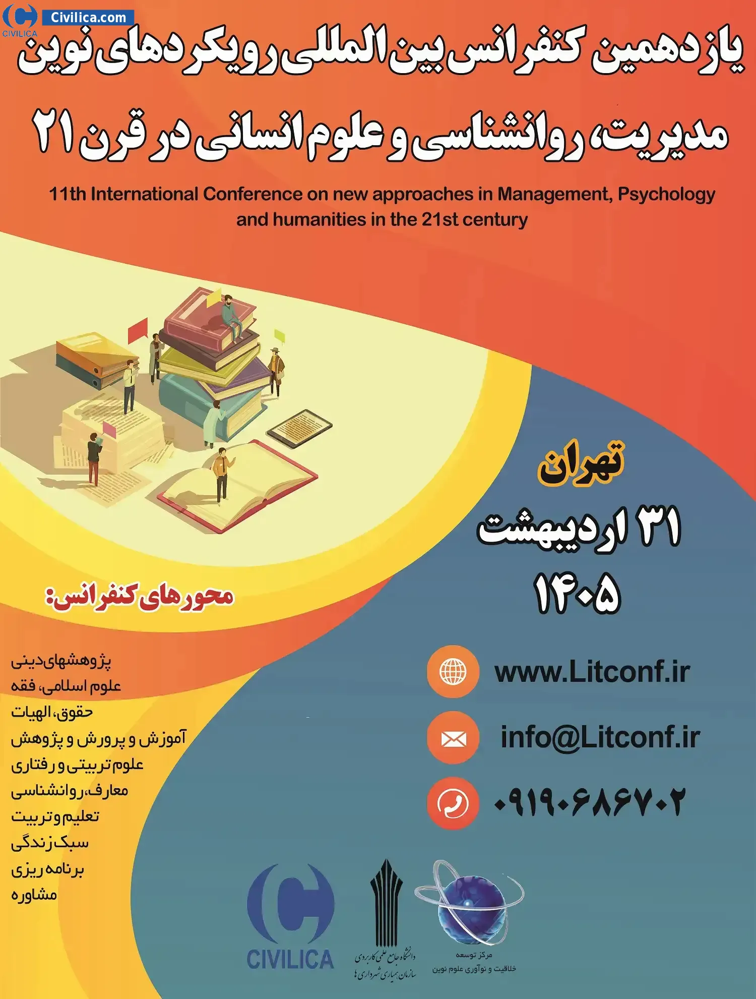 یازدهمین کنفرانس بین المللی رویکردهای نوین مدیریت، روانشناسی و علوم انسانی در قرن ۲۱ در تاریخ ۳۱ اردیبهشت ۱۴۰۵ توسط ،دانشگاه جامع علمی کاربردی سازمان همیاری شهرداری ها و مرکز توسعه خلاقیت و نوآوری علوم نوین در شهر تهران برگزار خواهد شد.با توجه به اینکه این همایش به صورت رسمی برگزار می گردد، کلیه مقالات این کنفرانس در پایگاه سیویلیکا و نیز کنسرسیوم محتوای ملی نمایه خواهد شد و شما می توانید با اطمینان کامل، مقالات خود را در این همایش ارائه نموده و از امتیازات علمی ارائه مقاله کنفرانس با دریافت گواهی کنفرانس استفاده نمایید.