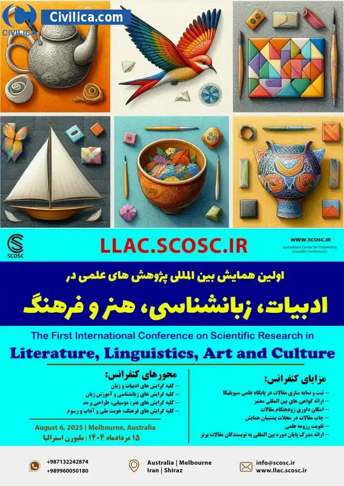 دومین همایش بین المللی پژوهش های علمی در ادبیات، زبانشناسی، هنر و فرهنگ در تاریخ ۱۵ مرداد ۱۴۰۵ توسط ،مرکز تخصصی برگزاری همایش ها برگزار خواهد شد.با توجه به اینکه این همایش به صورت رسمی برگزار می گردد، کلیه مقالات این کنفرانس در پایگاه سیویلیکا و نیز کنسرسیوم محتوای ملی نمایه خواهد شد و شما می توانید با اطمینان کامل، مقالات خود را در این همایش ارائه نموده و از امتیازات علمی ارائه مقاله کنفرانس با دریافت گواهی کنفرانس استفاده نمایید.