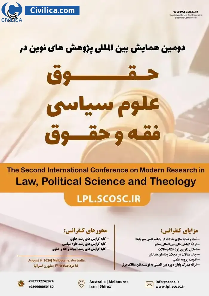 دومین همایش بین المللی پژوهش های نوین در حقوق، علوم سیاسی و فقه و حقوق در تاریخ ۱۵ مرداد ۱۴۰۵ توسط ،مرکز تخصصی برگزاری همایش ها برگزار خواهد شد.با توجه به اینکه این همایش به صورت رسمی برگزار می گردد، کلیه مقالات این کنفرانس در پایگاه سیویلیکا و نیز کنسرسیوم محتوای ملی نمایه خواهد شد و شما می توانید با اطمینان کامل، مقالات خود را در این همایش ارائه نموده و از امتیازات علمی ارائه مقاله کنفرانس با دریافت گواهی کنفرانس استفاده نمایید.