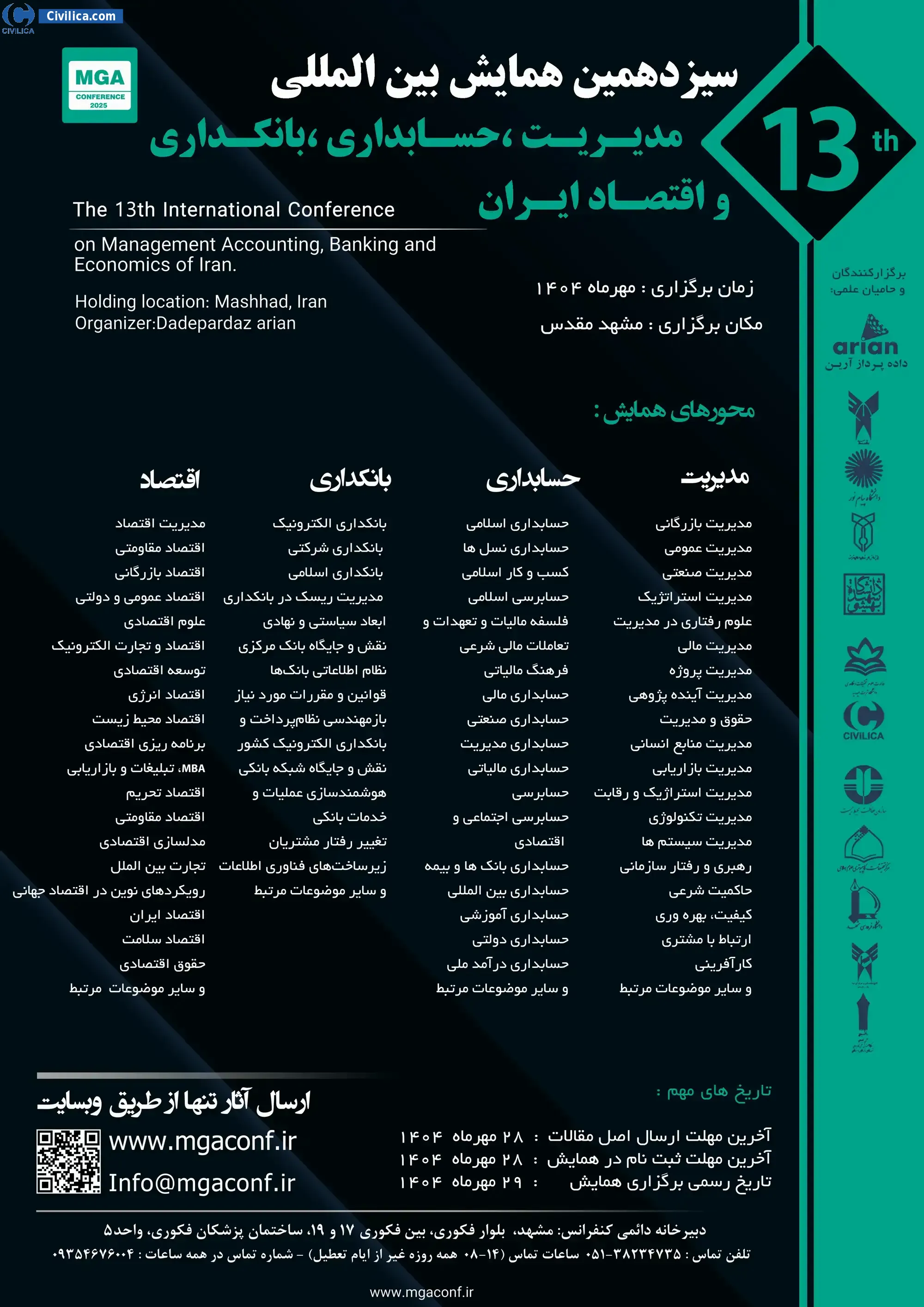 سیزدهمین کنفرانس بین المللی مدیریت، حسابداری، بانکداری و اقتصاد ایران در تاریخ ۲۹ مهر ۱۴۰۴ توسط ،دانش بنیان داده پرداز آرین با همکاری دانشگاهها معتبر ایران در شهر مشهد برگزار خواهد شد.با توجه به اینکه این همایش به صورت رسمی برگزار می گردد، کلیه مقالات این کنفرانس در پایگاه سیویلیکا و نیز کنسرسیوم محتوای ملی نمایه خواهد شد و شما می توانید با اطمینان کامل، مقالات خود را در این همایش ارائه نموده و از امتیازات علمی ارائه مقاله کنفرانس با دریافت گواهی کنفرانس استفاده نمایید.