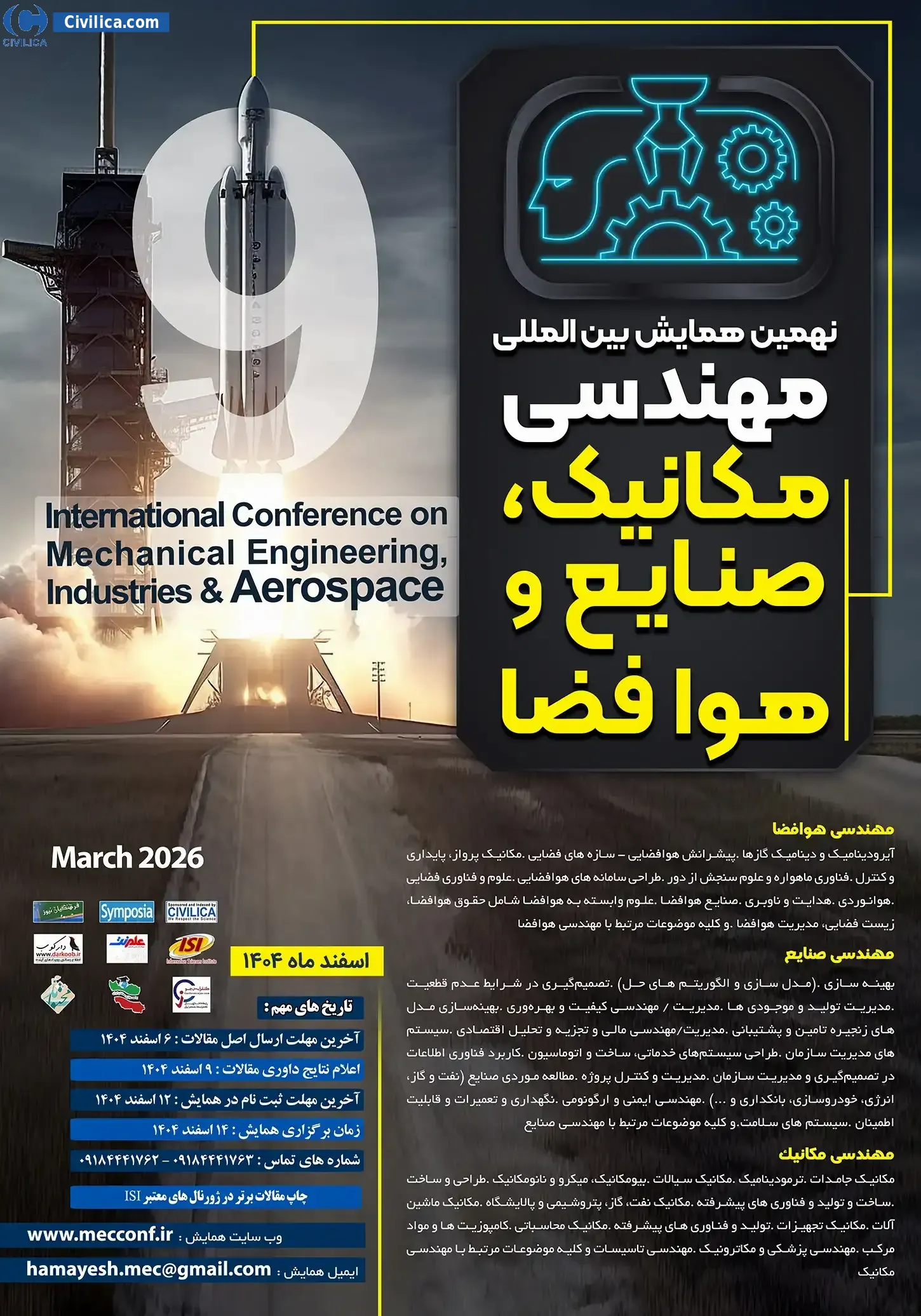 نهمین همایش بین المللی مهندسی مکانیک، صنایع و هوافضا در تاریخ ۱۴ اسفند ۱۴۰۴ توسط ،دبیرخانه دائمی کنفرانس در شهر همدان برگزار خواهد شد.با توجه به اینکه این همایش به صورت رسمی برگزار می گردد، کلیه مقالات این کنفرانس در پایگاه سیویلیکا و نیز کنسرسیوم محتوای ملی نمایه خواهد شد و شما می توانید با اطمینان کامل، مقالات خود را در این همایش ارائه نموده و از امتیازات علمی ارائه مقاله کنفرانس با دریافت گواهی کنفرانس استفاده نمایید.
