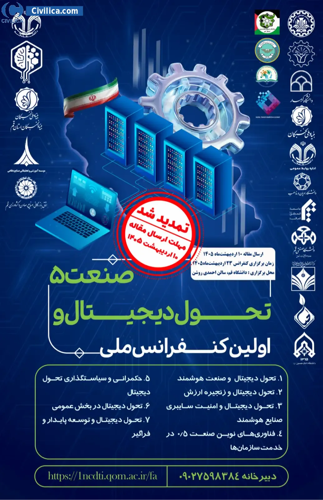 اولین کنفرانس ملی تحول دیجیتال و صنعت ۵.۰ در تاریخ ۲۳ اردیبهشت ۱۴۰۵ توسط دانشگاه قم، در شهر قم برگزار خواهد شد.با توجه به اینکه این همایش به صورت رسمی برگزار می گردد، کلیه مقالات این کنفرانس در پایگاه سیویلیکا و نیز کنسرسیوم محتوای ملی نمایه خواهد شد و شما می توانید با اطمینان کامل، مقالات خود را در این همایش ارائه نموده و از امتیازات علمی ارائه مقاله کنفرانس با دریافت گواهی کنفرانس استفاده نمایید.