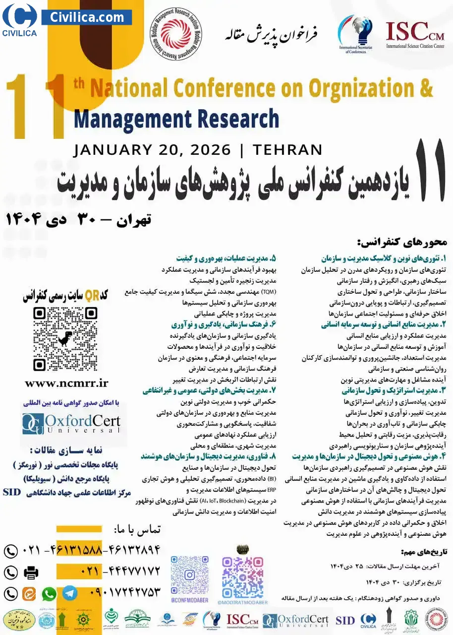 یازدهمین کنفرانس ملی پژوهش های سازمان و مدیریت در تاریخ ۳۰ بهمن ۱۴۰۴ توسط ،موسسه پژوهشی مدیریت مدبر و با مشارکت دانشگاه جامع علمی کاربردی خانه کارگر اسلامشهر و سایر مجامع علمی در شهر تهران برگزار خواهد شد.با توجه به اینکه این همایش به صورت رسمی برگزار می گردد، کلیه مقالات این کنفرانس در پایگاه سیویلیکا و نیز کنسرسیوم محتوای ملی نمایه خواهد شد و شما می توانید با اطمینان کامل، مقالات خود را در این همایش ارائه نموده و از امتیازات علمی ارائه مقاله کنفرانس با دریافت گواهی کنفرانس استفاده نمایید.