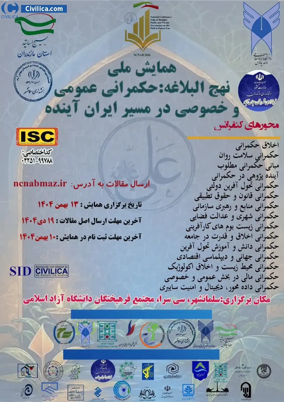 همایش ملی نهج البلاغه حکمرانی عمومی و خصوصی در مسیر ایران آینده در تاریخ ۱۳ بهمن ۱۴۰۴ توسط دانشگاه آزاد اسلامی واحد چالوس، در شهر چالوس برگزار خواهد شد.با توجه به اینکه این همایش به صورت رسمی برگزار می گردد، کلیه مقالات این کنفرانس در پایگاه سیویلیکا و نیز کنسرسیوم محتوای ملی نمایه خواهد شد و شما می توانید با اطمینان کامل، مقالات خود را در این همایش ارائه نموده و از امتیازات علمی ارائه مقاله کنفرانس با دریافت گواهی کنفرانس استفاده نمایید.