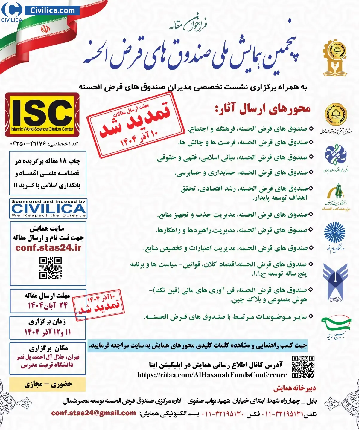 پنجمین همایش ملی صندوق های قرض الحسنه در تاریخ ۱۱ آذر ۱۴۰۴ توسط ،انجمن اقتصاد اسلامی ایرانصندوق قرض الحسنه توسعه عصر شمال برگزار گردید.این همایش تحت حمایت سیویلیکا بوده است و به محض اتمام مراحل نمایه سازی، مقالات آن از طریق همین پایگاه منتشر خواهد شد.