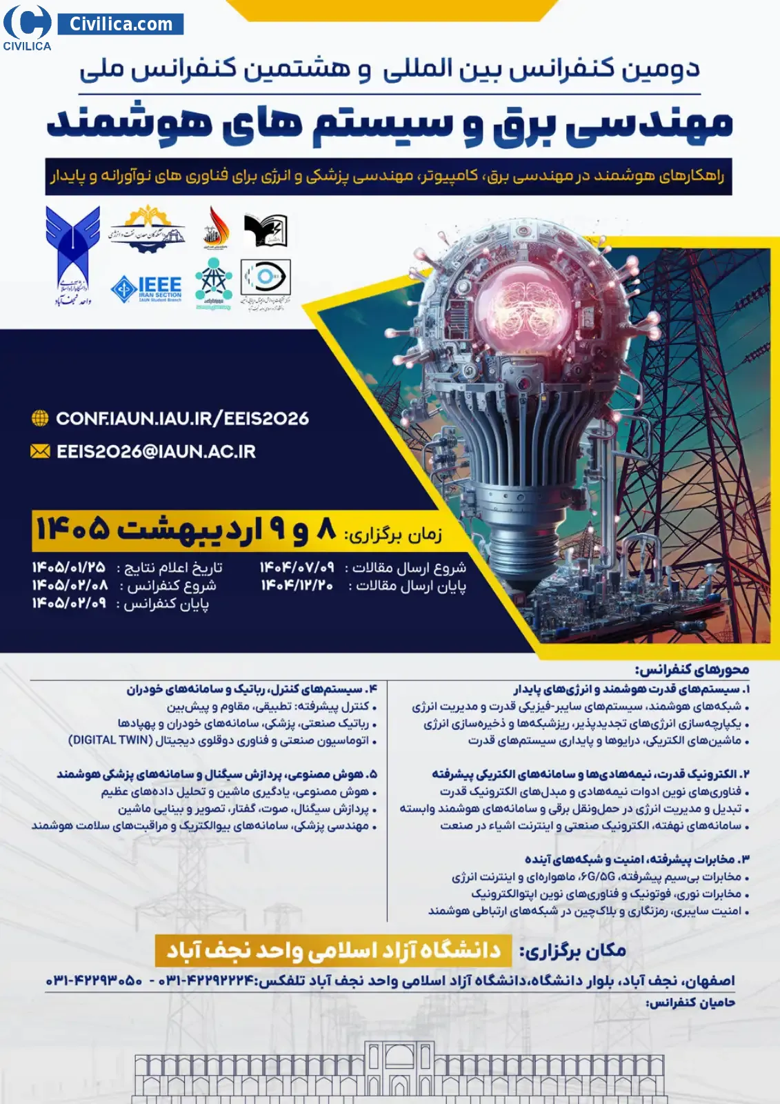 دومین کنفرانس بین المللی و هشتمین کنفرانس ملی مهندسی برق و سیستم های هوشمند ایران در تاریخ ۸ اردیبهشت ۱۴۰۵ توسط دانشگاه آزاد اسلامی واحد نجف آباد، در شهر نجف آباد برگزار خواهد شد.با توجه به اینکه این همایش به صورت رسمی برگزار می گردد، کلیه مقالات این کنفرانس در پایگاه سیویلیکا و نیز کنسرسیوم محتوای ملی نمایه خواهد شد و شما می توانید با اطمینان کامل، مقالات خود را در این همایش ارائه نموده و از امتیازات علمی ارائه مقاله کنفرانس با دریافت گواهی کنفرانس استفاده نمایید.