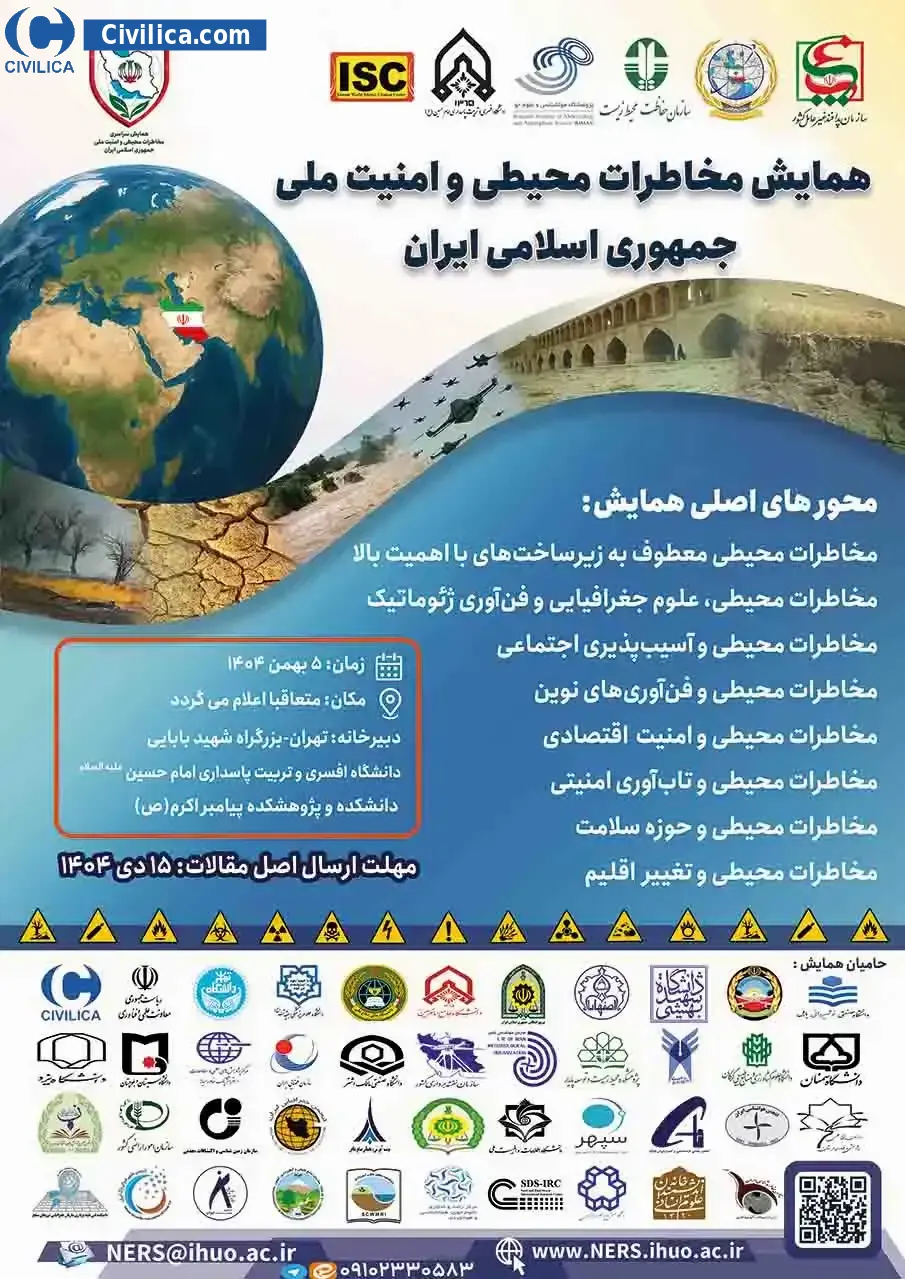 همایش ملی مخاطرات محیطی و امنیت ملی جمهوری اسلامی ایران در تاریخ ۵ بهمن ۱۴۰۴ توسط دانشگاه افسری و تربیت پاسداری امام حسین علیه السلام، در شهر تهران برگزار خواهد شد.با توجه به اینکه این همایش به صورت رسمی برگزار می گردد، کلیه مقالات این کنفرانس در پایگاه سیویلیکا و نیز کنسرسیوم محتوای ملی نمایه خواهد شد و شما می توانید با اطمینان کامل، مقالات خود را در این همایش ارائه نموده و از امتیازات علمی ارائه مقاله کنفرانس با دریافت گواهی کنفرانس استفاده نمایید.
