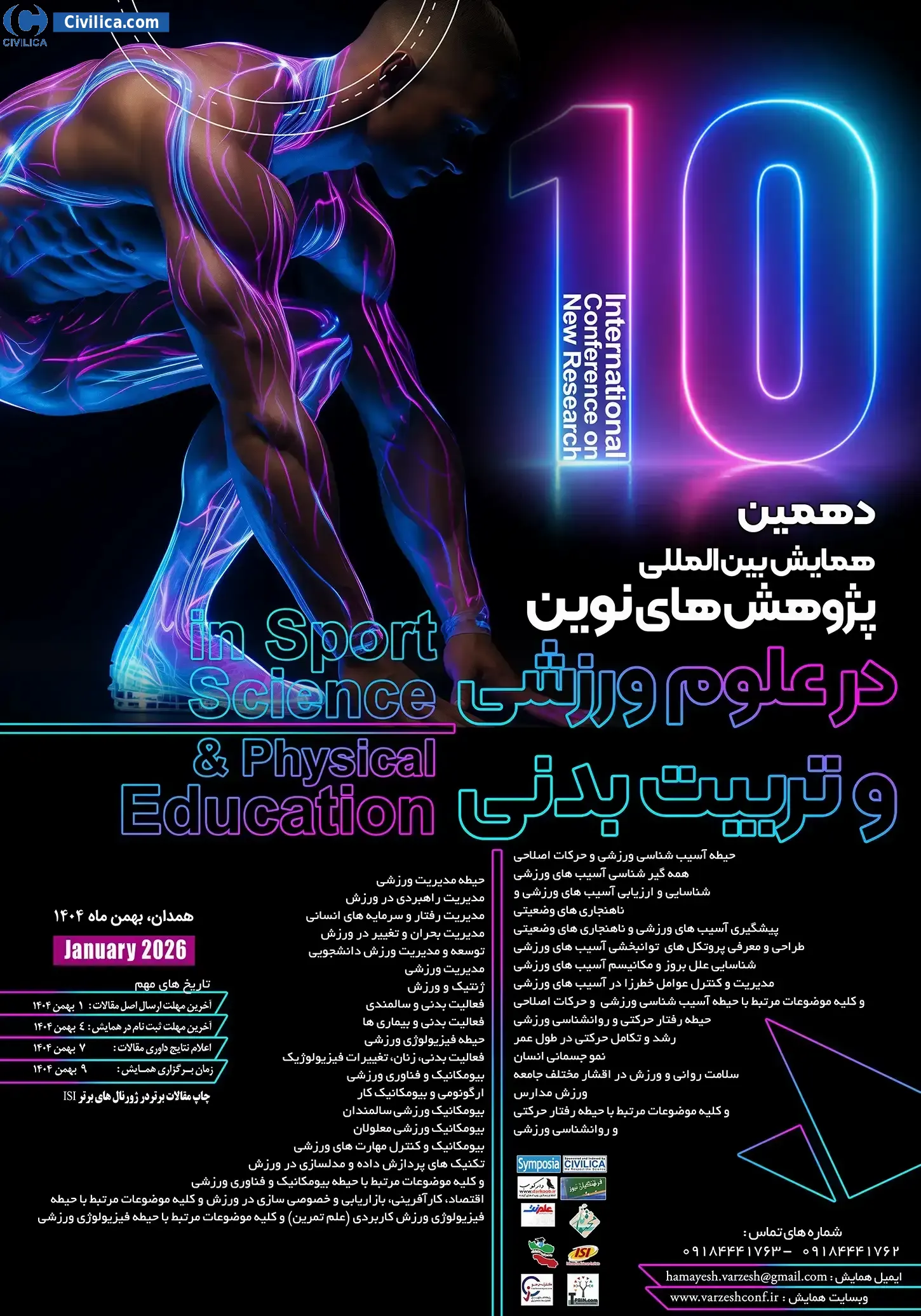 دهمین همایش بین المللی پژوهش های نوین در علوم ورزشی و تربیت بدنی در تاریخ ۹ بهمن ۱۴۰۴ توسط ،دبیرخانه دائمی کنفرانس در شهر همدان برگزار خواهد شد.با توجه به اینکه این همایش به صورت رسمی برگزار می گردد، کلیه مقالات این کنفرانس در پایگاه سیویلیکا و نیز کنسرسیوم محتوای ملی نمایه خواهد شد و شما می توانید با اطمینان کامل، مقالات خود را در این همایش ارائه نموده و از امتیازات علمی ارائه مقاله کنفرانس با دریافت گواهی کنفرانس استفاده نمایید.