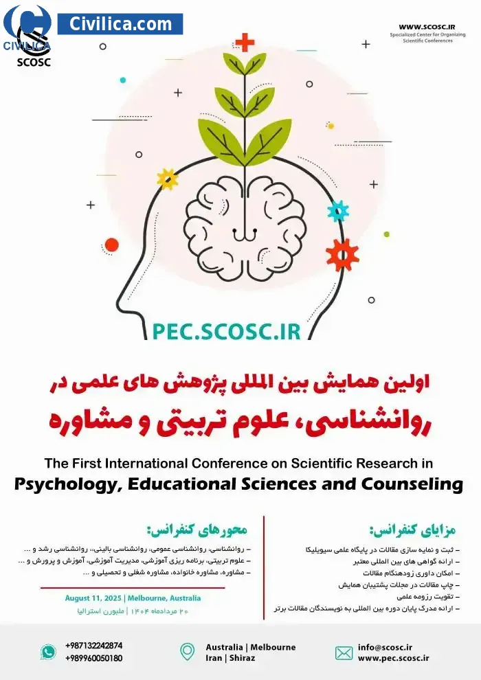 دومین همایش بین المللی پژوهش های علمی در روانشناسی، علوم تربیتی و مشاوره در تاریخ ۲۰ مرداد ۱۴۰۵ توسط ،مرکز تخصصی برگزاری همایش ها برگزار خواهد شد.با توجه به اینکه این همایش به صورت رسمی برگزار می گردد، کلیه مقالات این کنفرانس در پایگاه سیویلیکا و نیز کنسرسیوم محتوای ملی نمایه خواهد شد و شما می توانید با اطمینان کامل، مقالات خود را در این همایش ارائه نموده و از امتیازات علمی ارائه مقاله کنفرانس با دریافت گواهی کنفرانس استفاده نمایید.