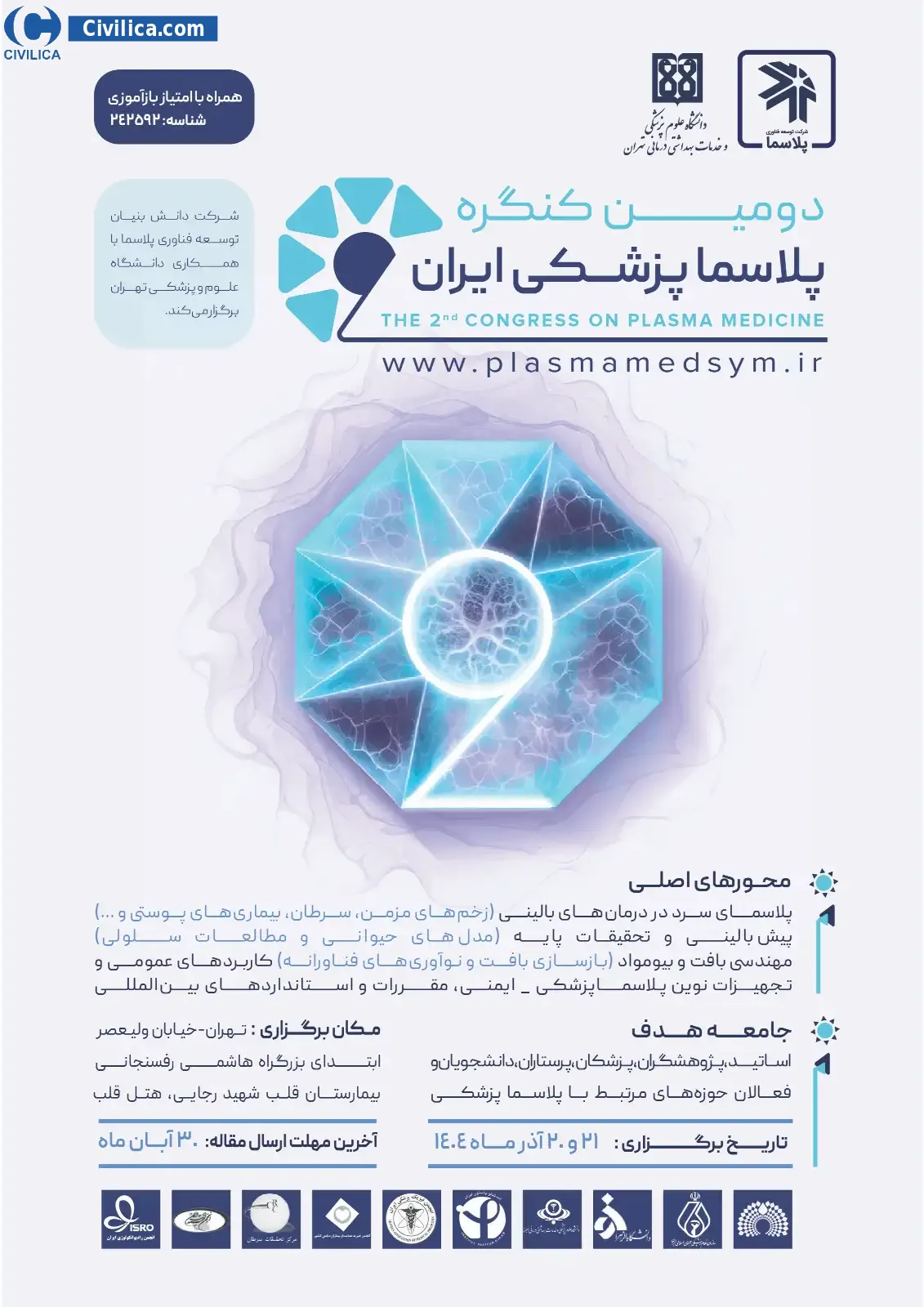 دومین کنگره پلاسماپزشکی ایران در تاریخ ۲۰ آذر ۱۴۰۴ توسط ،شرکت دانش بنیان توسعه فناوری پلاسمادانشگاه علوم پزشکی تهران در شهر تهران برگزار گردید.این همایش تحت حمایت سیویلیکا بوده است و به محض اتمام مراحل نمایه سازی، مقالات آن از طریق همین پایگاه منتشر خواهد شد.