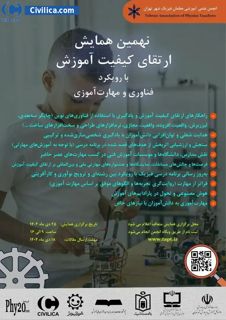 نهمین همایش ملی ارتقای کیفیت آموزش با رویکرد فناوری و مهارت آموزی در تاریخ ۲۵ دی ۱۴۰۴ توسط ،انجمن علمی آموزشی دبیران فیزیک شهر تهران در شهر تهران برگزار خواهد شد.با توجه به اینکه این همایش به صورت رسمی برگزار می گردد، کلیه مقالات این کنفرانس در پایگاه سیویلیکا و نیز کنسرسیوم محتوای ملی نمایه خواهد شد و شما می توانید با اطمینان کامل، مقالات خود را در این همایش ارائه نموده و از امتیازات علمی ارائه مقاله کنفرانس با دریافت گواهی کنفرانس استفاده نمایید.