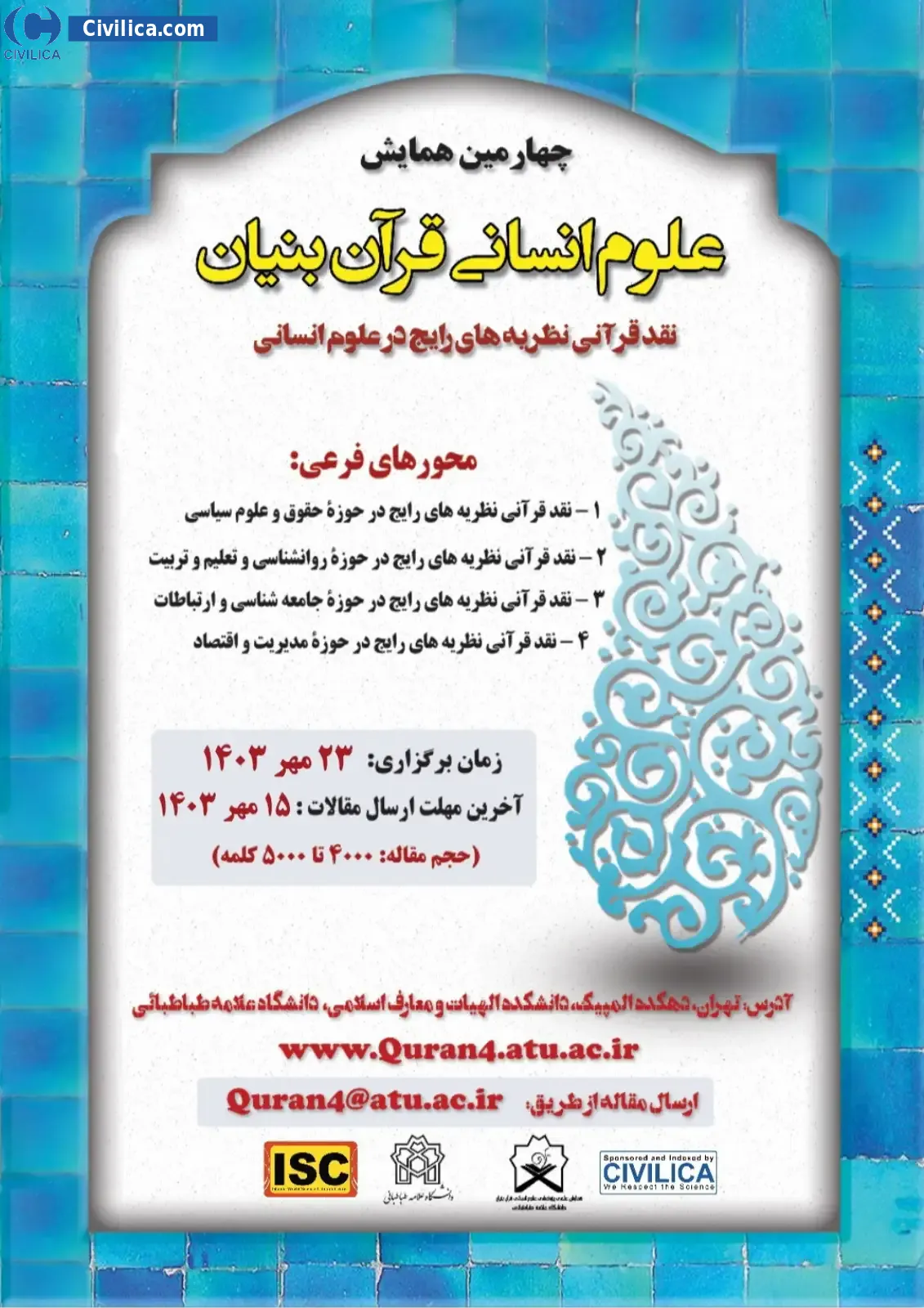 چهارمین همایش علوم انسانی قرآن بنیان در تاریخ ۲۳ مهر ۱۴۰۳ توسط دانشگاه علامه طباطبائی، برگزار گردید.این همایش تحت حمایت سیویلیکا بوده است و به محض اتمام مراحل نمایه سازی، مقالات آن از طریق همین پایگاه منتشر خواهد شد.