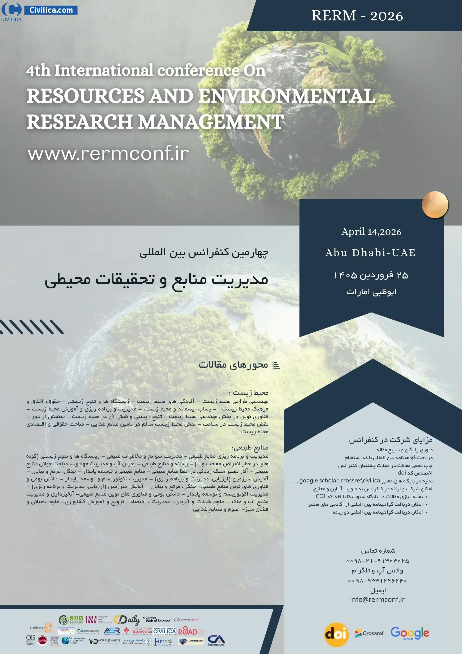 چهارمین کنفرانس بین المللی مدیریت منابع و تحقیقات محیطی در تاریخ ۲۵ فروردین ۱۴۰۵ توسط ،همایش آروین البرز برگزار خواهد شد.با توجه به اینکه این همایش به صورت رسمی برگزار می گردد، کلیه مقالات این کنفرانس در پایگاه سیویلیکا و نیز کنسرسیوم محتوای ملی نمایه خواهد شد و شما می توانید با اطمینان کامل، مقالات خود را در این همایش ارائه نموده و از امتیازات علمی ارائه مقاله کنفرانس با دریافت گواهی کنفرانس استفاده نمایید.