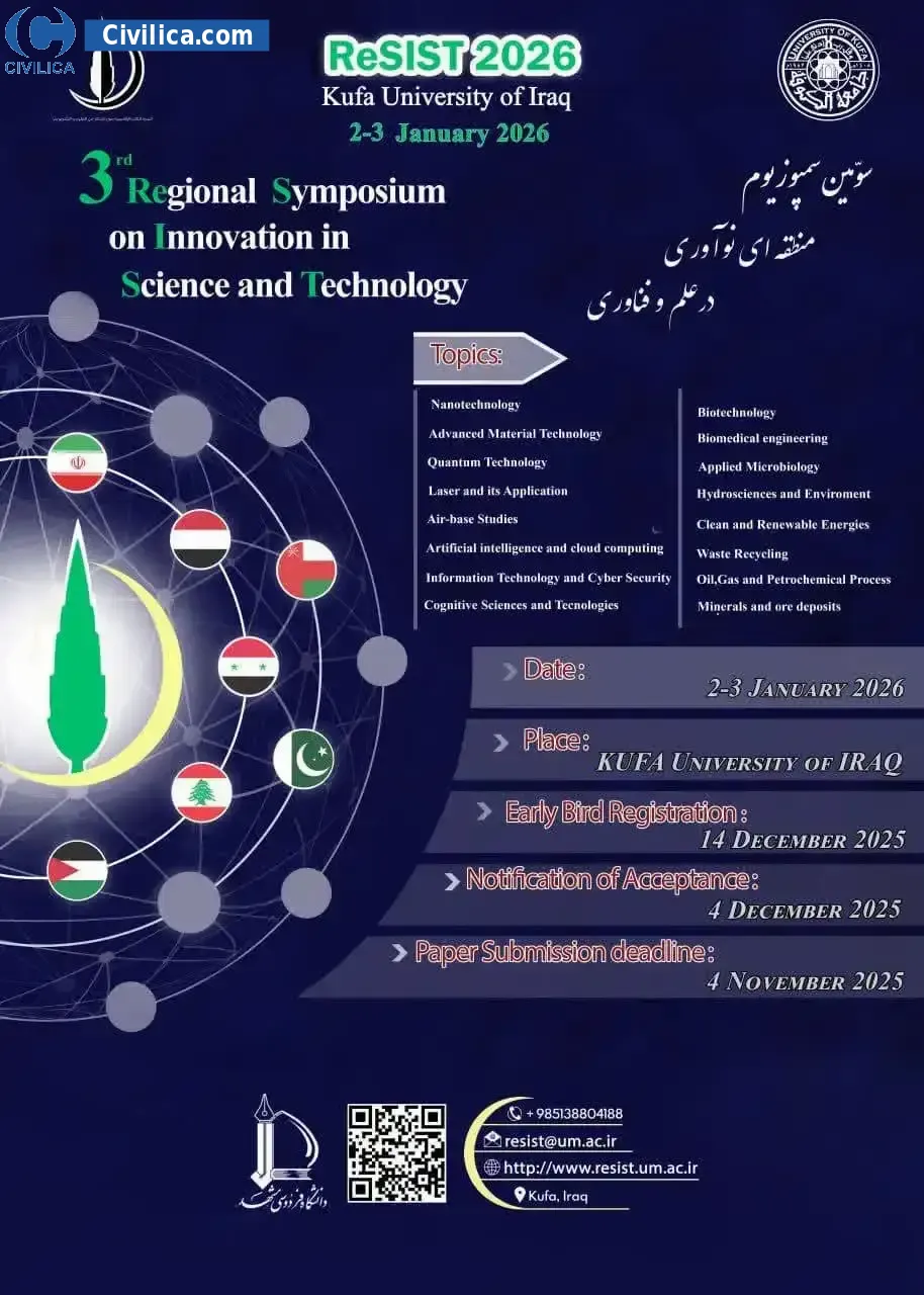 سومین سمپوزیوم منطقه ای نوآوری در علم و فناوری در تاریخ ۱۲ دی ۱۴۰۴ توسط دانشگاه فردوسی مشهد،دانشگاه کوفه در شهر مشهد برگزار خواهد شد.با توجه به اینکه این همایش به صورت رسمی برگزار می گردد، کلیه مقالات این کنفرانس در پایگاه سیویلیکا و نیز کنسرسیوم محتوای ملی نمایه خواهد شد و شما می توانید با اطمینان کامل، مقالات خود را در این همایش ارائه نموده و از امتیازات علمی ارائه مقاله کنفرانس با دریافت گواهی کنفرانس استفاده نمایید.