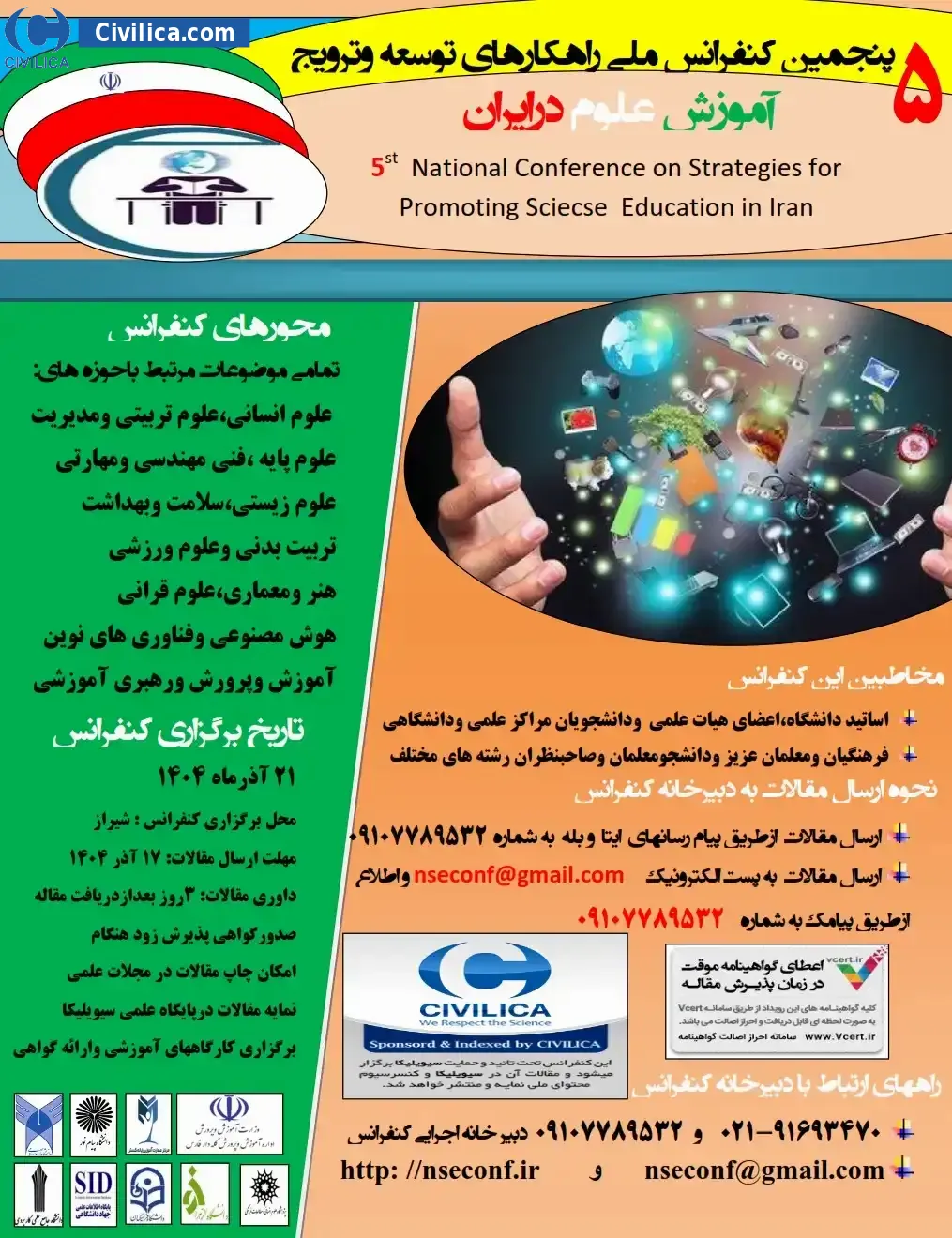 پنجمین کنفرانس ملی راهکارهای توسعه وترویج آموزش علوم درایران در تاریخ ۲۱ آذر ۱۴۰۴ توسط ،دانشگاههای ومراکز علمی دانشگاهی ومرکز مهارت آموزی رایانه گستر وادارات آموزش وپرورش مجامع علمی ودانشگاهی در شهر شیراز برگزار خواهد شد.با توجه به اینکه این همایش به صورت رسمی برگزار می گردد، کلیه مقالات این کنفرانس در پایگاه سیویلیکا و نیز کنسرسیوم محتوای ملی نمایه خواهد شد و شما می توانید با اطمینان کامل، مقالات خود را در این همایش ارائه نموده و از امتیازات علمی ارائه مقاله کنفرانس با دریافت گواهی کنفرانس استفاده نمایید.