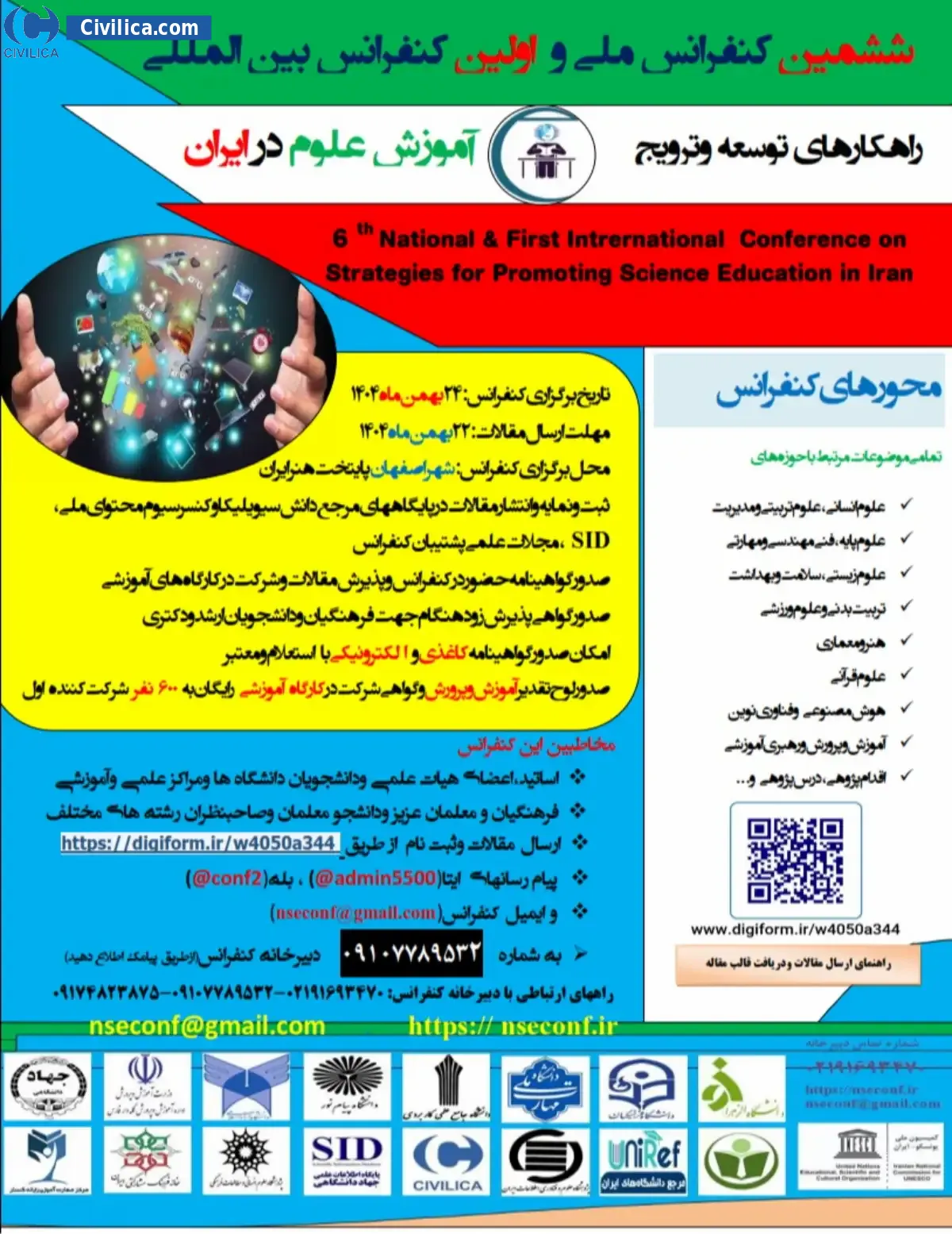 ششمین کنفرانس ملی واولین کنفرانس بین المللی راهکارهای توسعه وترویج آموزش علوم درایران در تاریخ ۲۴ بهمن ۱۴۰۴ توسط ،دانشگاهها ،مراکز علمی آموزشی وادارات آموزش وپرورش ،مرکز مهارت آموزی رایانه گستر با همکاری مجامع ومراکز علمی آموزشی ودانشگاهی در شهر اصفهان برگزار خواهد شد.با توجه به اینکه این همایش به صورت رسمی برگزار می گردد، کلیه مقالات این کنفرانس در پایگاه سیویلیکا و نیز کنسرسیوم محتوای ملی نمایه خواهد شد و شما می توانید با اطمینان کامل، مقالات خود را در این همایش ارائه نموده و از امتیازات علمی ارائه مقاله کنفرانس با دریافت گواهی کنفرانس استفاده نمایید.