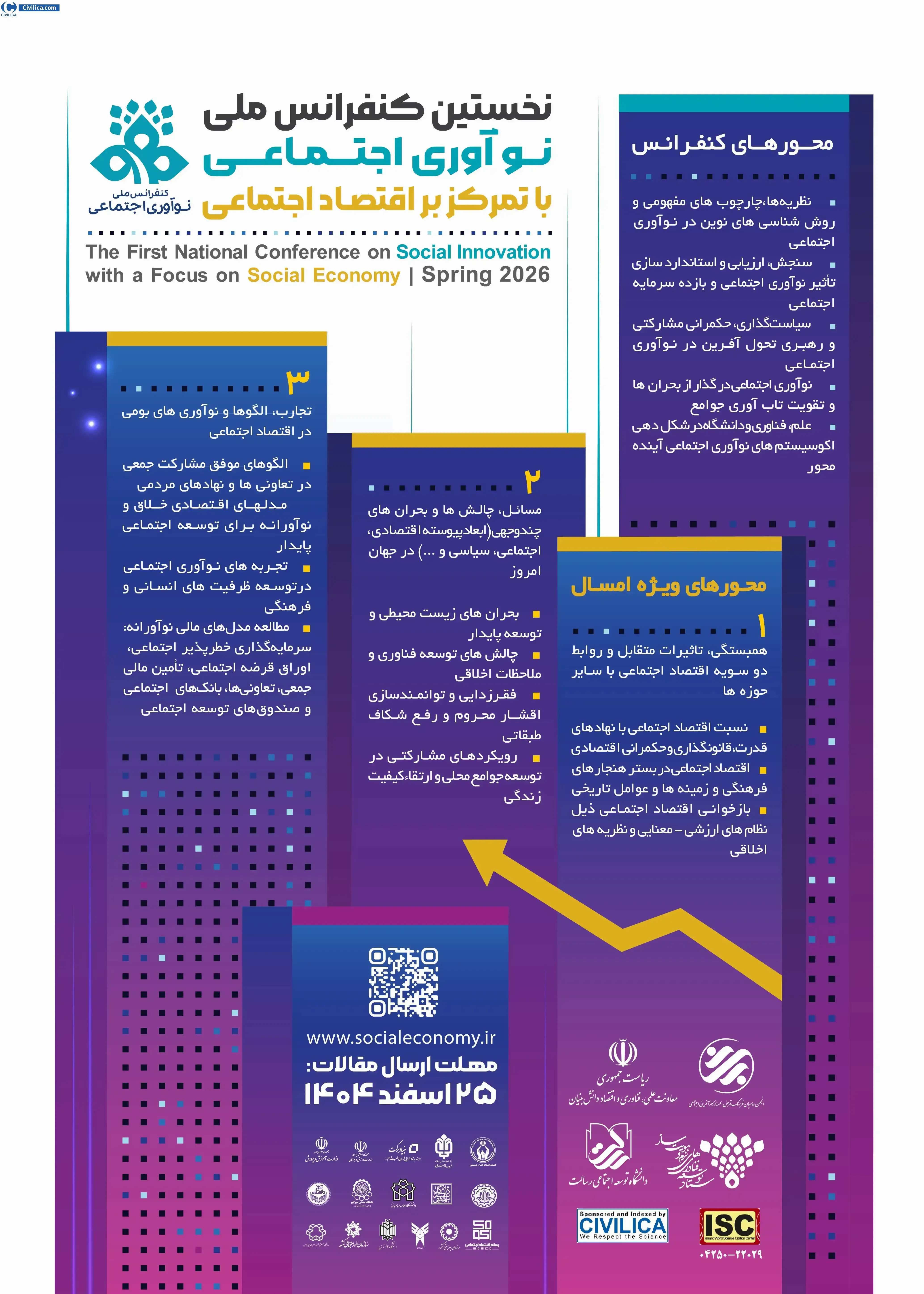 نخستین کنفرانس ملی نوآوری اجتماعی (با تمرکز بر اقتصاد اجتماعی) در تاریخ ۲۰ اردیبهشت ۱۴۰۵ توسط ،معاونت علمی، فناوری و اقتصاد دانش بنیان ریاست جمهوریدانشگاه توسعه اجتماعی رسالت در شهر تهران برگزار خواهد شد.با توجه به اینکه این همایش به صورت رسمی برگزار می گردد، کلیه مقالات این کنفرانس در پایگاه سیویلیکا و نیز کنسرسیوم محتوای ملی نمایه خواهد شد و شما می توانید با اطمینان کامل، مقالات خود را در این همایش ارائه نموده و از امتیازات علمی ارائه مقاله کنفرانس با دریافت گواهی کنفرانس استفاده نمایید.