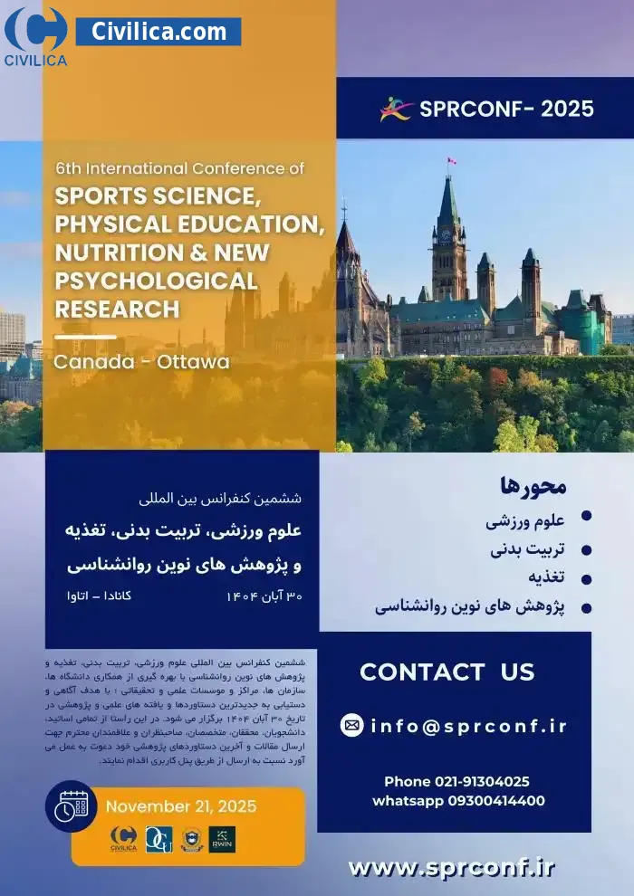 ششمین کنفرانس بین المللی علوم ورزشی، تربیت بدنی، تغذیه و پژوهش های نوین روانشناسی در تاریخ ۳۰ آبان ۱۴۰۴ توسط ،همایش آروین البرز برگزار خواهد شد.با توجه به اینکه این همایش به صورت رسمی برگزار می گردد، کلیه مقالات این کنفرانس در پایگاه سیویلیکا و نیز کنسرسیوم محتوای ملی نمایه خواهد شد و شما می توانید با اطمینان کامل، مقالات خود را در این همایش ارائه نموده و از امتیازات علمی ارائه مقاله کنفرانس با دریافت گواهی کنفرانس استفاده نمایید.