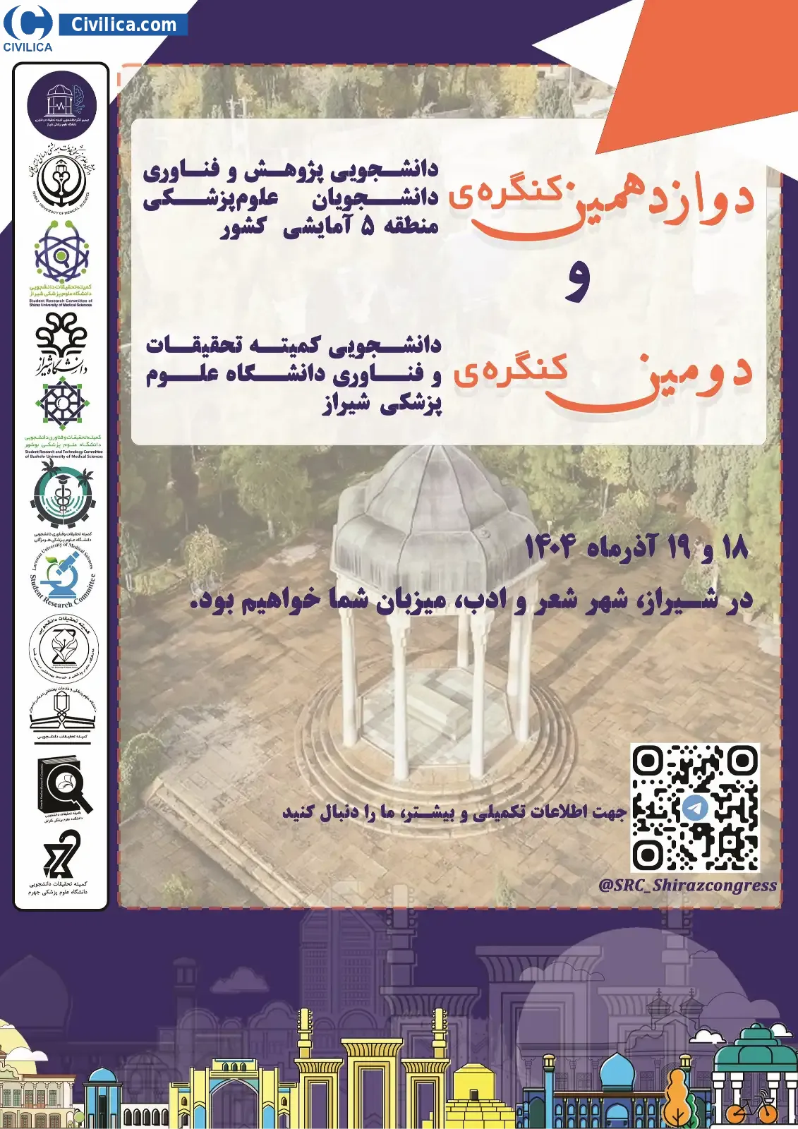 دوازدهمین کنگره ی پژوهش و فناوری دانشجویان علوم پزشکی منطقه ۵ آمایشی کشور و دومین کنگره ی کمیته تحقیقات و فناوری دانشجویی دانشگاه علوم پزشکی شیراز در تاریخ ۱۸ آذر ۱۴۰۴ توسط دانشگاه علوم پزشکی و خدمات بهداشتی درمانی استان فارس،کمیته تحقیقات و فناوری دانشجویی دانشگاه علوم پزشکی شیراز در شهر شیراز برگزار خواهد شد.با توجه به اینکه این همایش به صورت رسمی برگزار می گردد، کلیه مقالات این کنفرانس در پایگاه سیویلیکا و نیز کنسرسیوم محتوای ملی نمایه خواهد شد و شما می توانید با اطمینان کامل، مقالات خود را در این همایش ارائه نموده و از امتیازات علمی ارائه مقاله کنفرانس با دریافت گواهی کنفرانس استفاده نمایید.