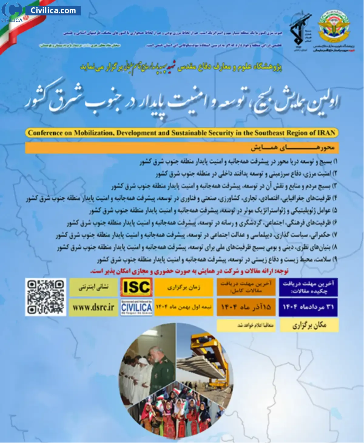 همایش «بسیج، پیشرفت و امنیت پایدار در منطقه جنوب شرق کشور» در تاریخ ۶ بهمن ۱۴۰۴ توسط ،پژوهشگاه علوم و معارف دفاع مقدس شهید سپهبد پاسدار حاج قاسم سلیمانینیروی زمینی سپاه پاسداران انقلاب اسلامی در شهر تهران برگزار گردید.این همایش تحت حمایت سیویلیکا بوده است و به محض اتمام مراحل نمایه سازی، مقالات آن از طریق همین پایگاه منتشر خواهد شد.