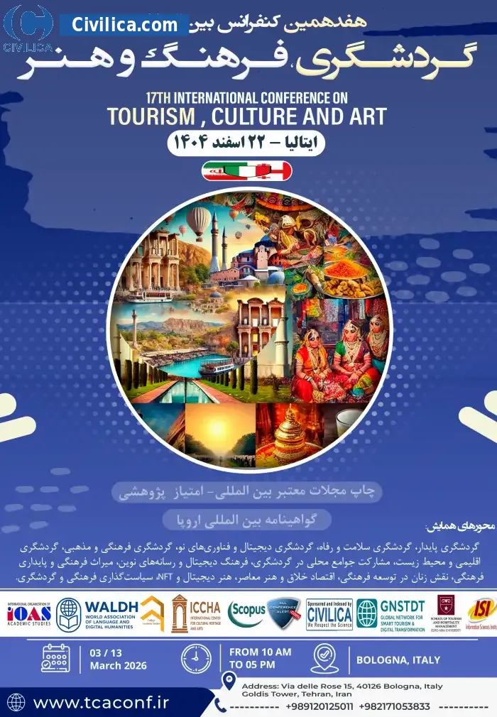 هفدهمین کنفرانس بین المللی گردشگری، فرهنگ و هنر در تاریخ ۲۲ اسفند ۱۴۰۴ توسط ،سازمان بین المللی مطالعات دانشگاهی برگزار خواهد شد.با توجه به اینکه این همایش به صورت رسمی برگزار می گردد، کلیه مقالات این کنفرانس در پایگاه سیویلیکا و نیز کنسرسیوم محتوای ملی نمایه خواهد شد و شما می توانید با اطمینان کامل، مقالات خود را در این همایش ارائه نموده و از امتیازات علمی ارائه مقاله کنفرانس با دریافت گواهی کنفرانس استفاده نمایید.