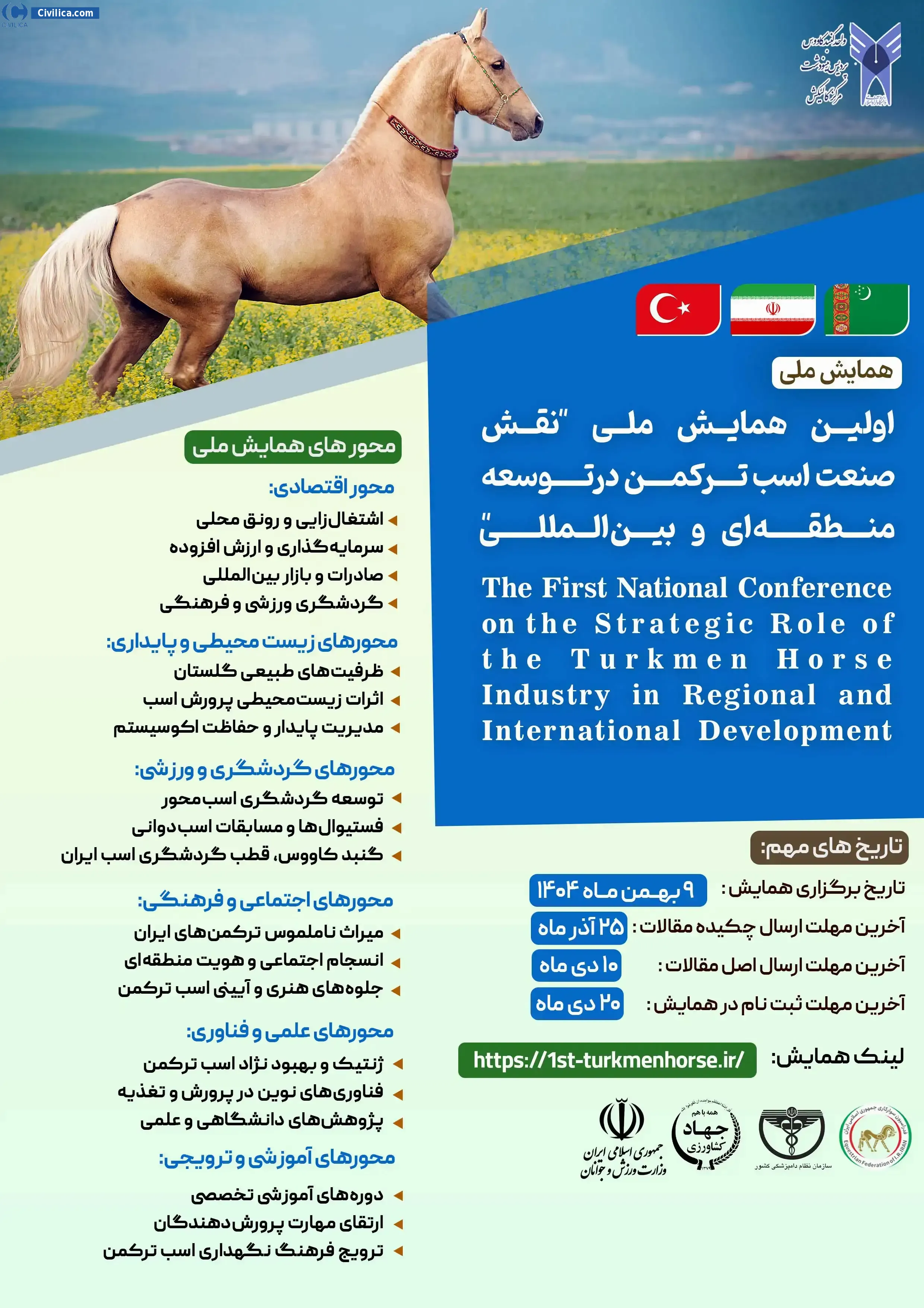 اولین همایش ملی "نقش صنعت اسب ترکمن درتوسعه منطقه ای و بین المللی" در تاریخ ۸ بهمن ۱۴۰۴ توسط دانشگاه آزاد اسلامی واحد گنبد کاووس، در شهر گنبد کاووس برگزار خواهد شد.با توجه به اینکه این همایش به صورت رسمی برگزار می گردد، کلیه مقالات این کنفرانس در پایگاه سیویلیکا و نیز کنسرسیوم محتوای ملی نمایه خواهد شد و شما می توانید با اطمینان کامل، مقالات خود را در این همایش ارائه نموده و از امتیازات علمی ارائه مقاله کنفرانس با دریافت گواهی کنفرانس استفاده نمایید.