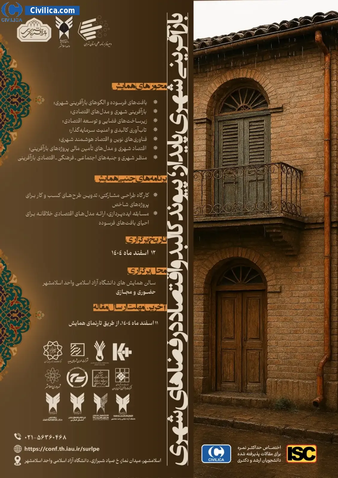 سومین همایش ملی «بازآفرینی شهری پایدار؛ پیوند کالبد و اقتصاد در فضاهای شهری» در تاریخ ۱۲ اسفند ۱۴۰۴ توسط دانشگاه آزاد اسلامی واحد اسلامشهر، در شهر اسلامشهر برگزار خواهد شد.با توجه به اینکه این همایش به صورت رسمی برگزار می گردد، کلیه مقالات این کنفرانس در پایگاه سیویلیکا و نیز کنسرسیوم محتوای ملی نمایه خواهد شد و شما می توانید با اطمینان کامل، مقالات خود را در این همایش ارائه نموده و از امتیازات علمی ارائه مقاله کنفرانس با دریافت گواهی کنفرانس استفاده نمایید.